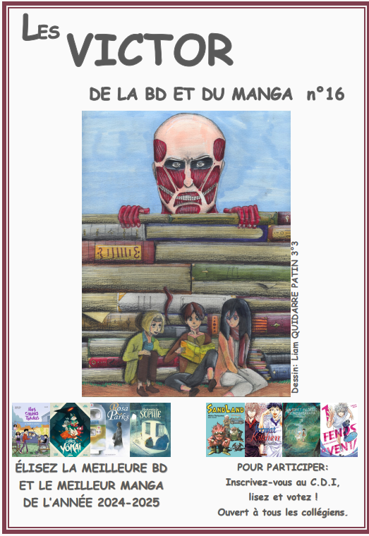 Vous lisez 4 BDs ou 4 mangas du CDI et vous choisissez le livre que vous avez préféré. C'est très simple ! Le descriptif des titres est en bas de page.