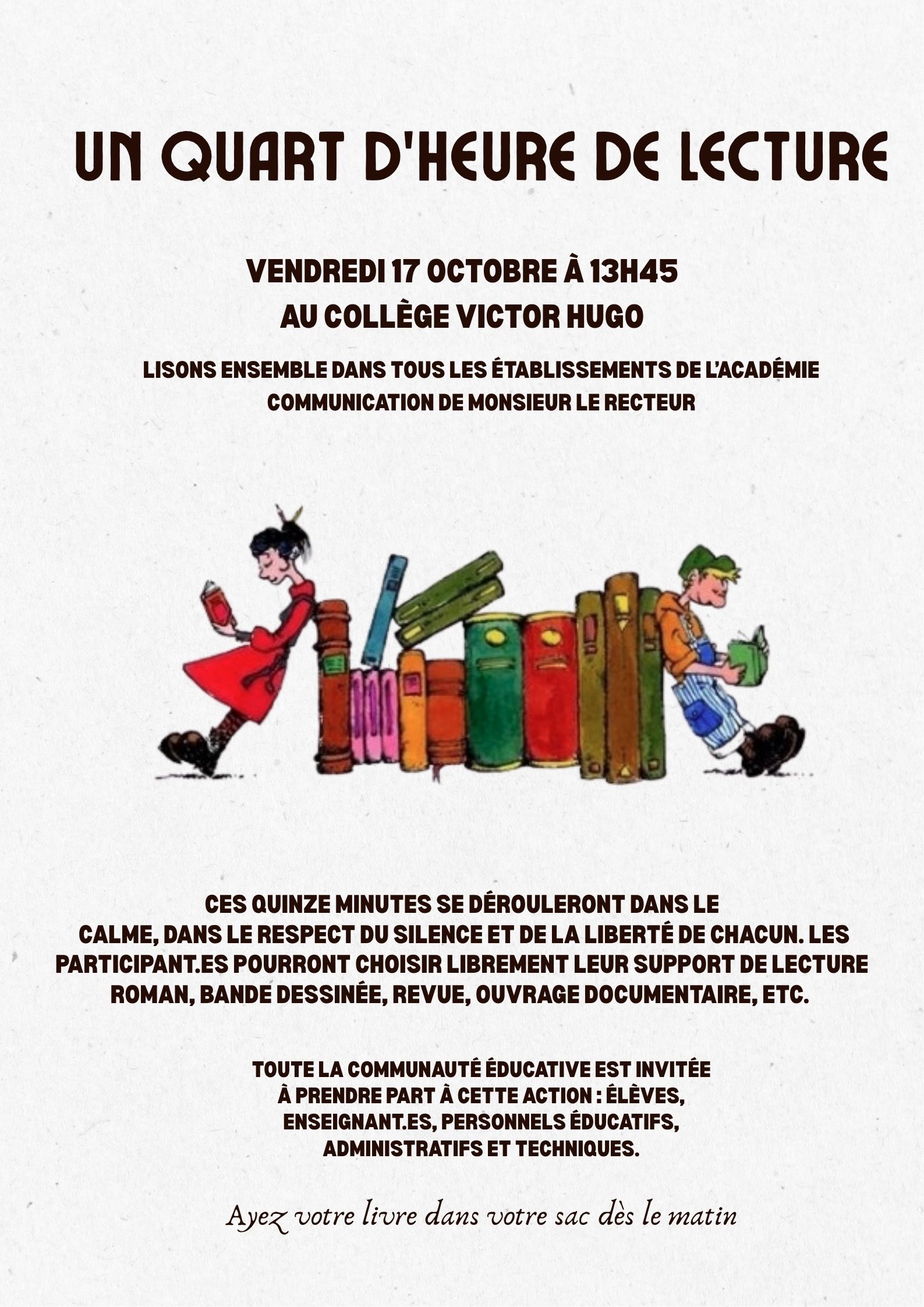 Quart d'heure lecture au collège vendredi 17 octobre à 13h45