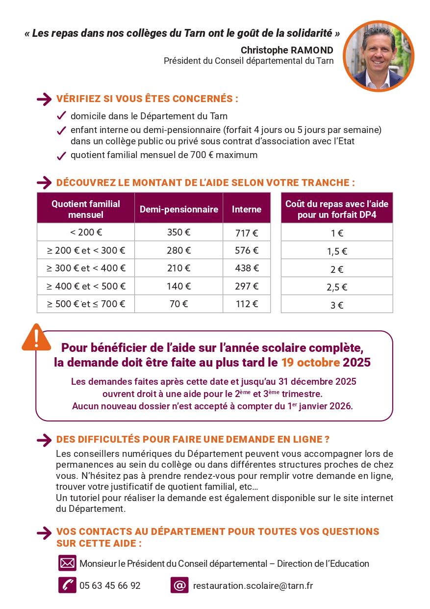 En cas de problème d'inscription, contacter le service restauration du département au 05 63 45 66 92.